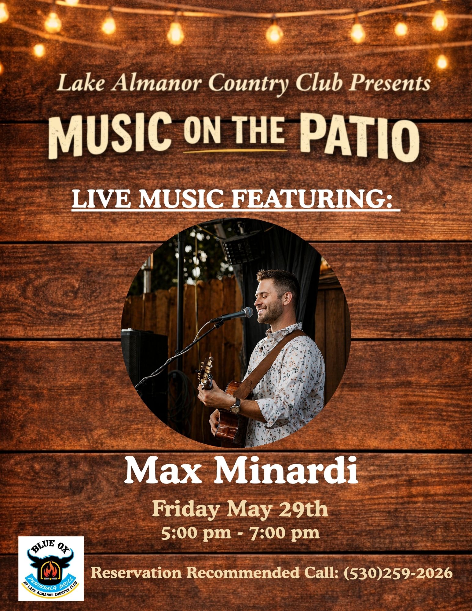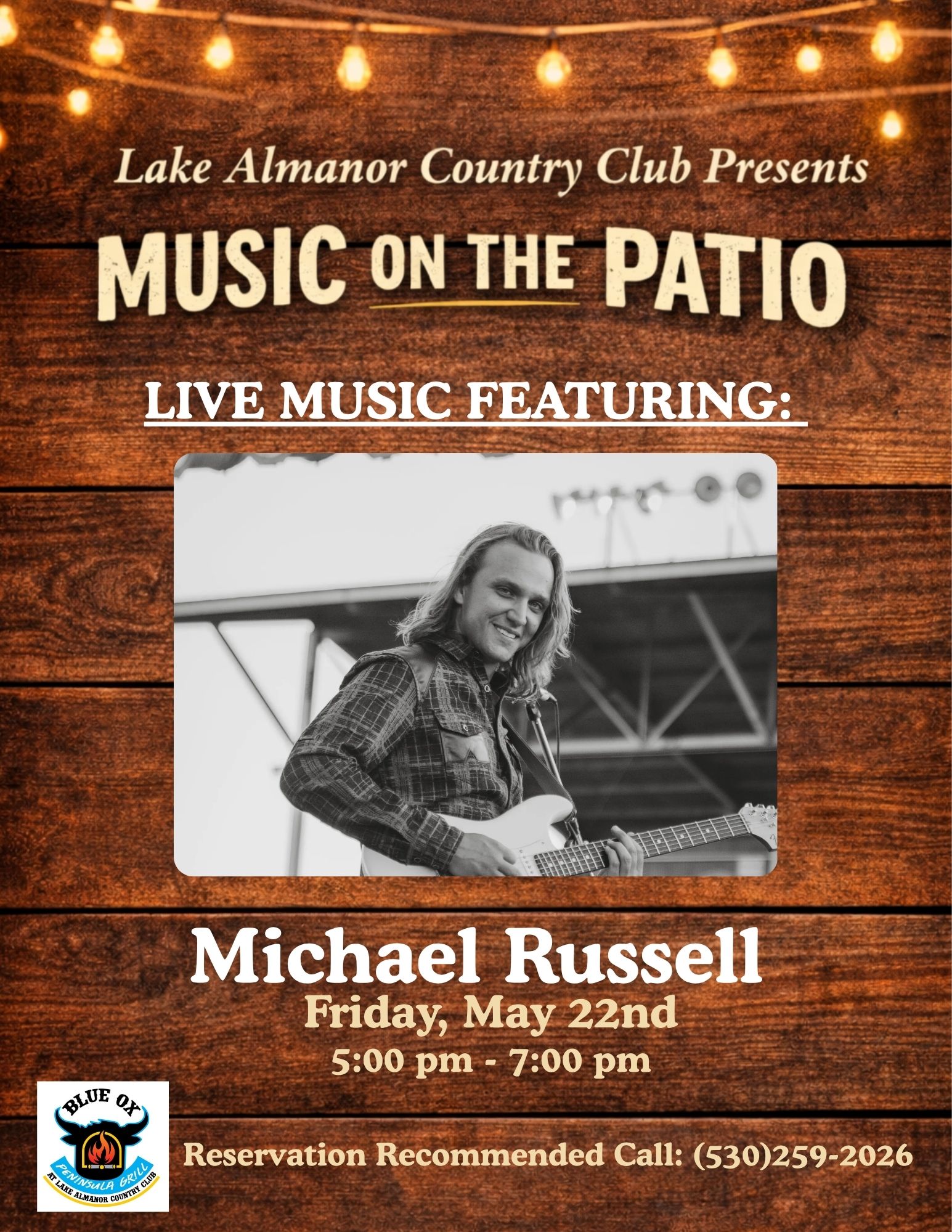 Lake Almanor Country Club presents a Music on the Patio event, featuring: The Sun Followers. Come enjoy delicious food and live music Thursday, May 7th @ 5 pm - 7 pm on the clubhouse patio. Blue Ox Peninsula Grill at Lake Almanor Country Club: Hours of Operation: 7 am - 8 pm Reservation recommended, please call: 530-259-2026
