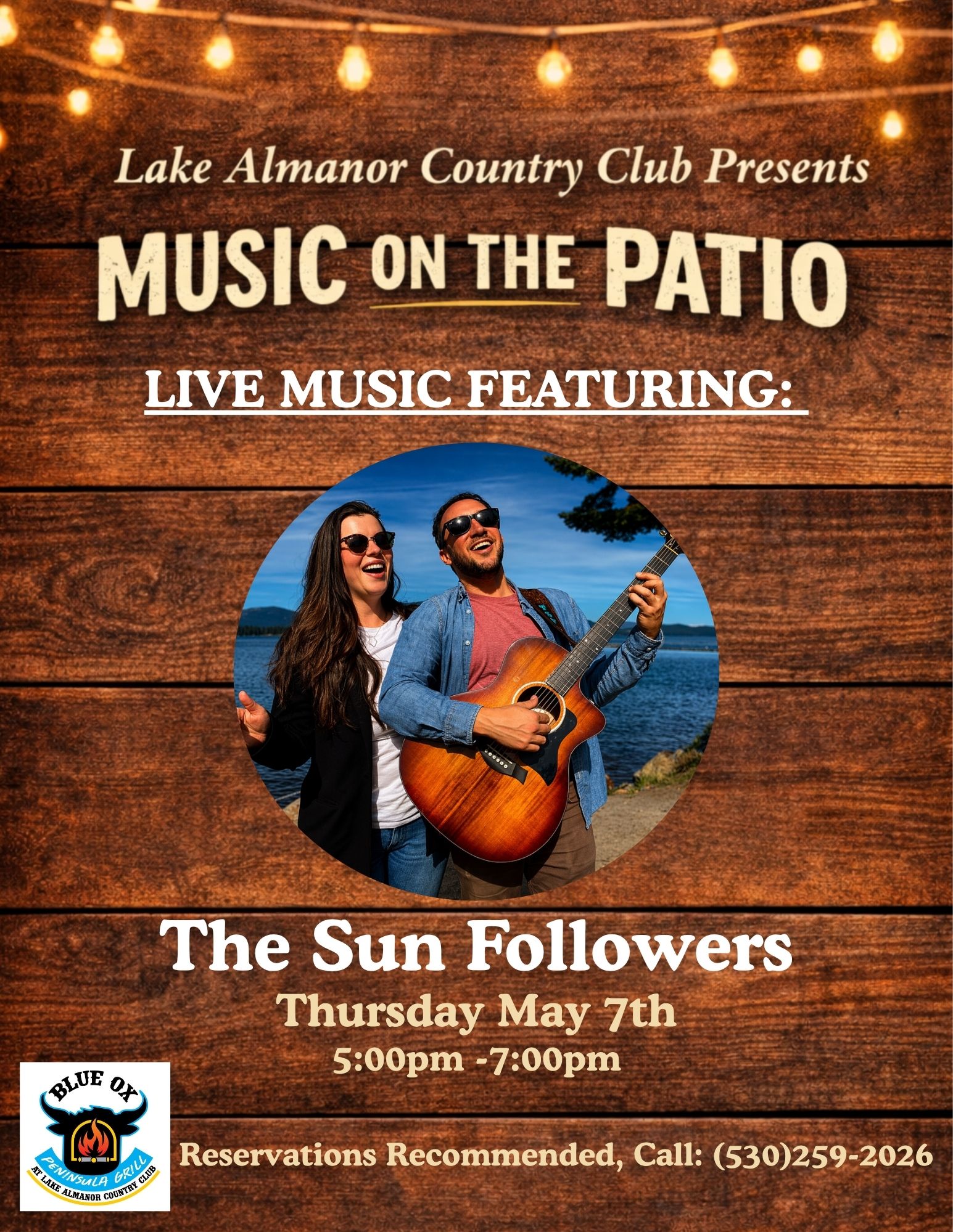 Lake Almanor Country Club presents a Music on the Patio event, featuring: The Sun Followers. Come enjoy delicious food and live music Thursday, May 7th @ 5 pm - 7 pm on the clubhouse patio. Blue Ox Peninsula Grill at Lake Almanor Country Club: Hours of Operation: 7 am - 8 pm Reservation recommended, please call: 530-259-2026